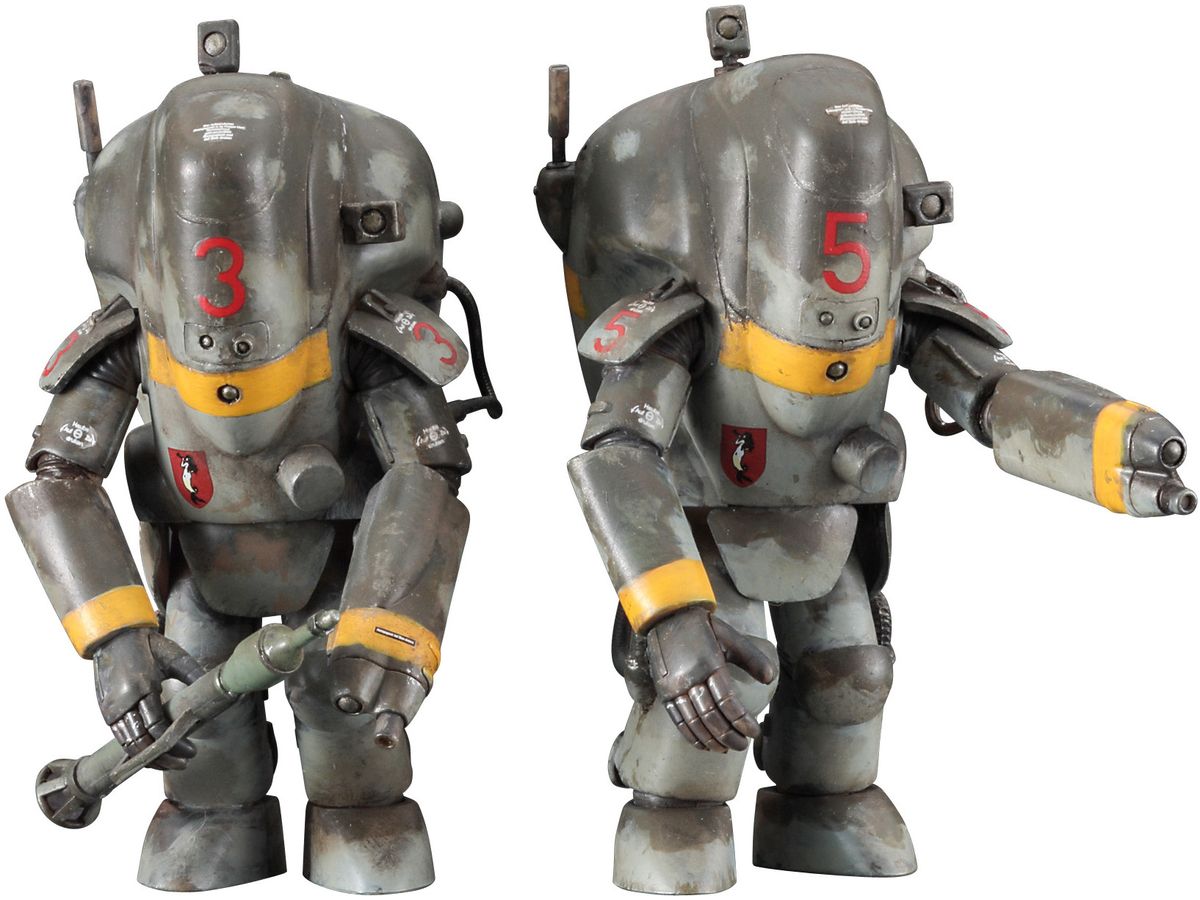 ハセガワ製に関しましては説明書通りに組み立て、安定して立たせるために足部品の中に釣り用のオモリを仕込みました。イエサブ製については自宅に在庫しているモノの中から工兵仕様のヤツを選択してハセガワ製のモノとの差別化をしました。パーティングラインを削って表面処理を行い、ピアノ線にてアンテナを追加。前腕(ぜんわん)には100円ショップで購入した付け爪を貼って装甲板っぽくしてみました。
